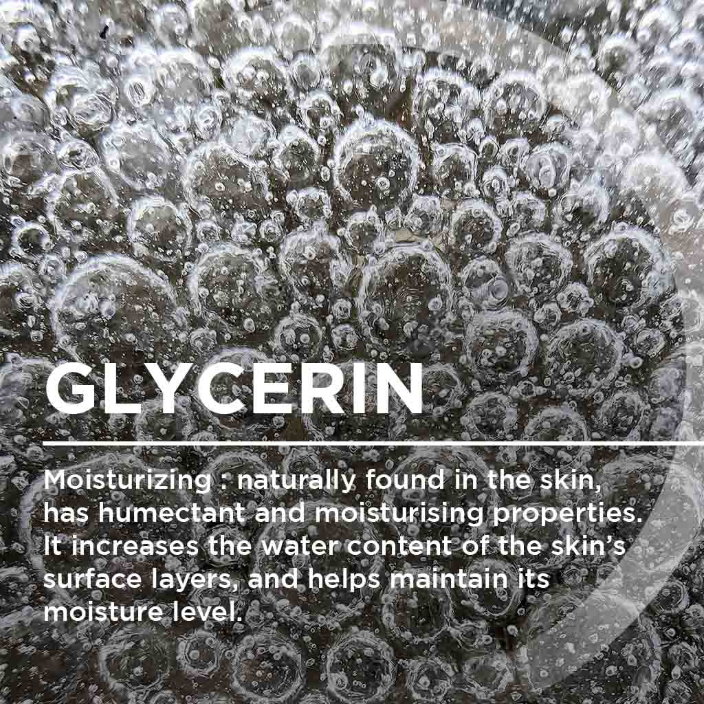 • Glycerin (الجلسرين): يرطب البشرة بعمق ويحافظ على نعومتها.