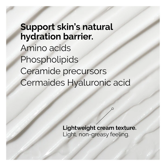 يجمع الكريم بين عوامل الترطيب الطبيعية (NMF) – وهي مكونات موجودة طبيعيًا في البشرة مثل الأحماض الأمينية، والأحماض الدهنية، والجلسرين، واليوريا – مع حمض الهيالورونيك (HA) لضمان ترطيب طويل الأمد وحماية من فقدان الرطوبة الناتج عن العوامل البيئية القاسية مثل الجفاف والرياح.