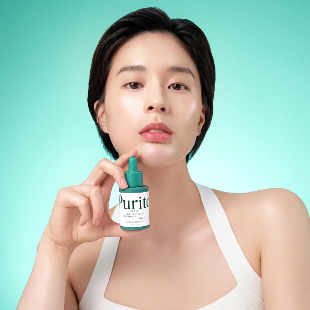 استعيدي توازن بشرتك مع Purito Seoul Mighty Bamboo Panthenol Serum، سيروم مركز بتركيبة داعمة لحاجز البشرة، مصمم لتهدئة التهيج، تقليل الجفاف، وتعزيز احتفاظ البشرة بالرطوبة.