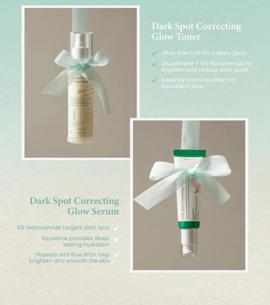 مجموعة AXIS-Y Glow Your Own Way Set هي مجموعة عناية متكاملة بإصدار محدود صُممت خصيصًا لدعم إشراقة البشرة، توحيد لونها، وتقليل مظهر البقع الداكنة بخطوات مدروسة ولطيفة تناسب مختلف أنواع البشرة، خاصة الحساسة.