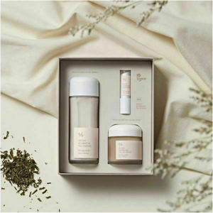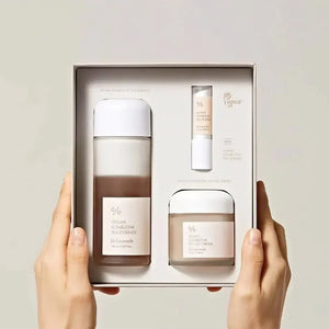 - محتويات المجموعة: تحتوي المجموعة على ثلاثة منتجات (الإيسنس، الكريم الجل، بلسم الشفاه) مما يجعلها كاملة للعناية بالبشرة.