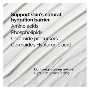 يجمع الكريم بين عوامل الترطيب الطبيعية (NMF) – وهي مكونات موجودة طبيعيًا في البشرة مثل الأحماض الأمينية، والأحماض الدهنية، والجلسرين، واليوريا – مع حمض الهيالورونيك (HA) لضمان ترطيب طويل الأمد وحماية من فقدان الرطوبة الناتج عن العوامل البيئية القاسية مثل الجفاف والرياح.